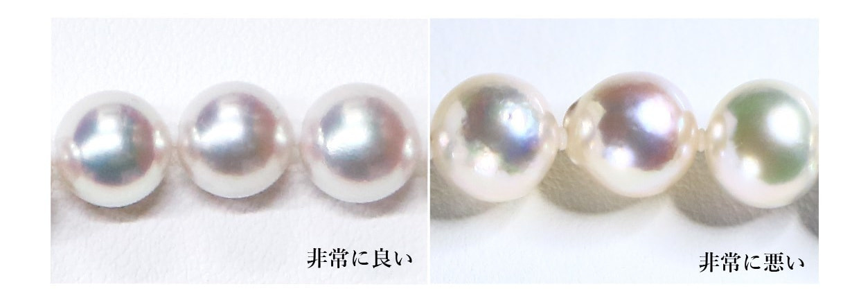 良いテリの真珠は明るくシャープな輝きをしており、悪いテリの真珠は明るさも鈍く、光の拡散がぼんやりしております。高品質な真珠のテリは、真珠層に均一性があり、厚く積み重なっているのが特徴です。