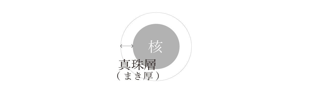 巻きとは核の周りに作られた真珠層を意味します。耐久性や、色の深み、光沢と深い関係があります。巻きには一定の厚みがあり、その厚みが均一であることが良い巻きの判断基準の1つとなります。巻き厚を生み出すには養殖期間が必要で、巻き厚は品質要素ではとても重要になります。
